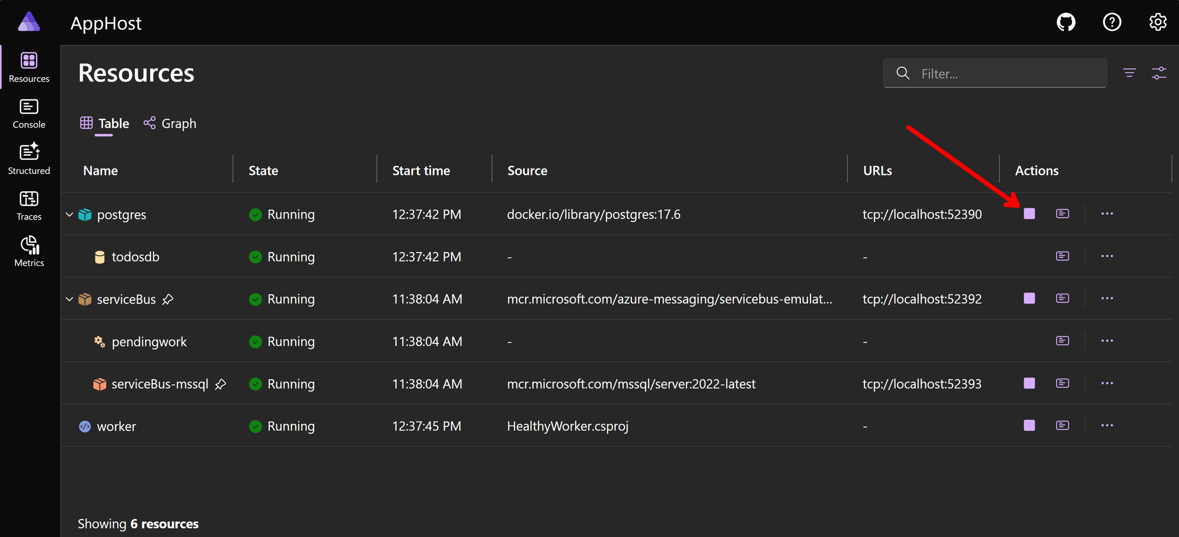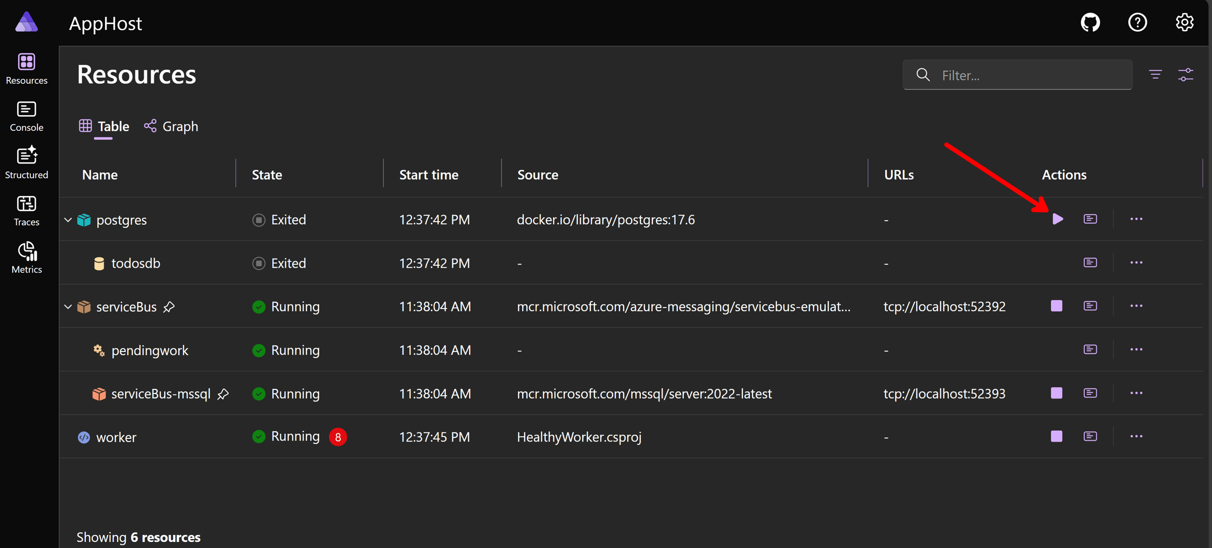 Let’s simulate PostgreSQL coming back by restarting the resource in the Dashboard: