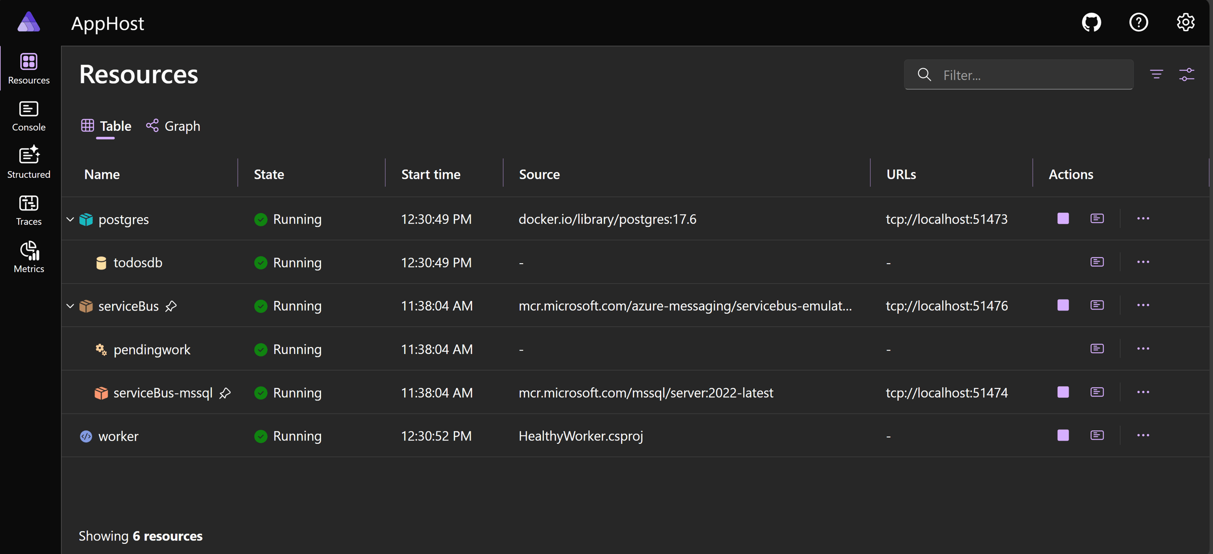 Since I added .NET Aspire to my repo, I can easily start my worker with all dependencies and see the initial status of everything in the Dashboard: