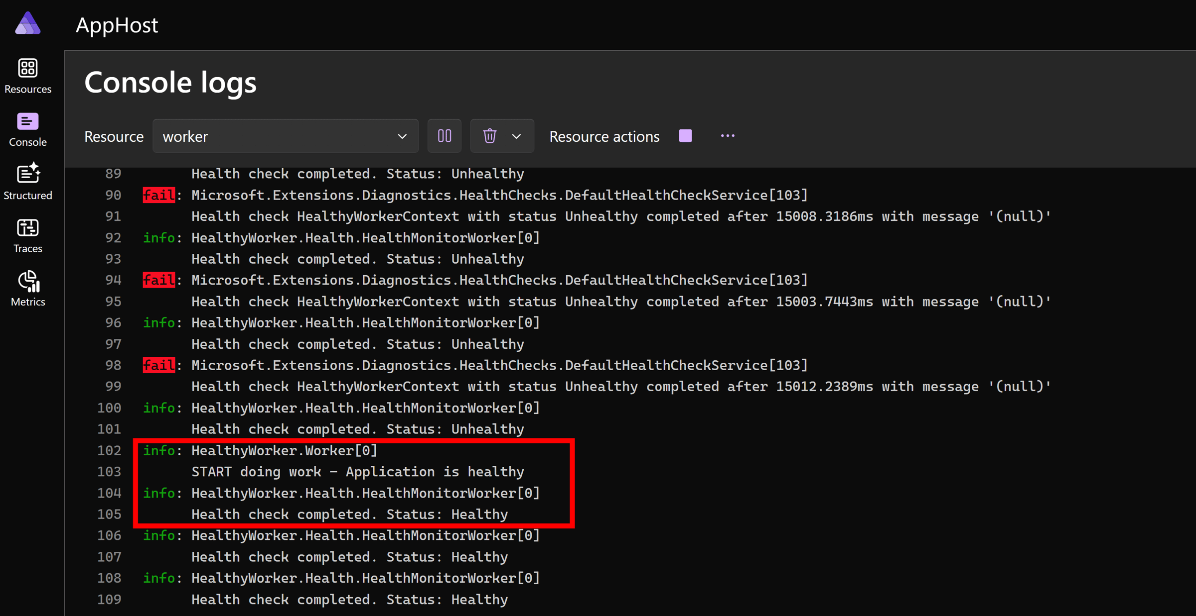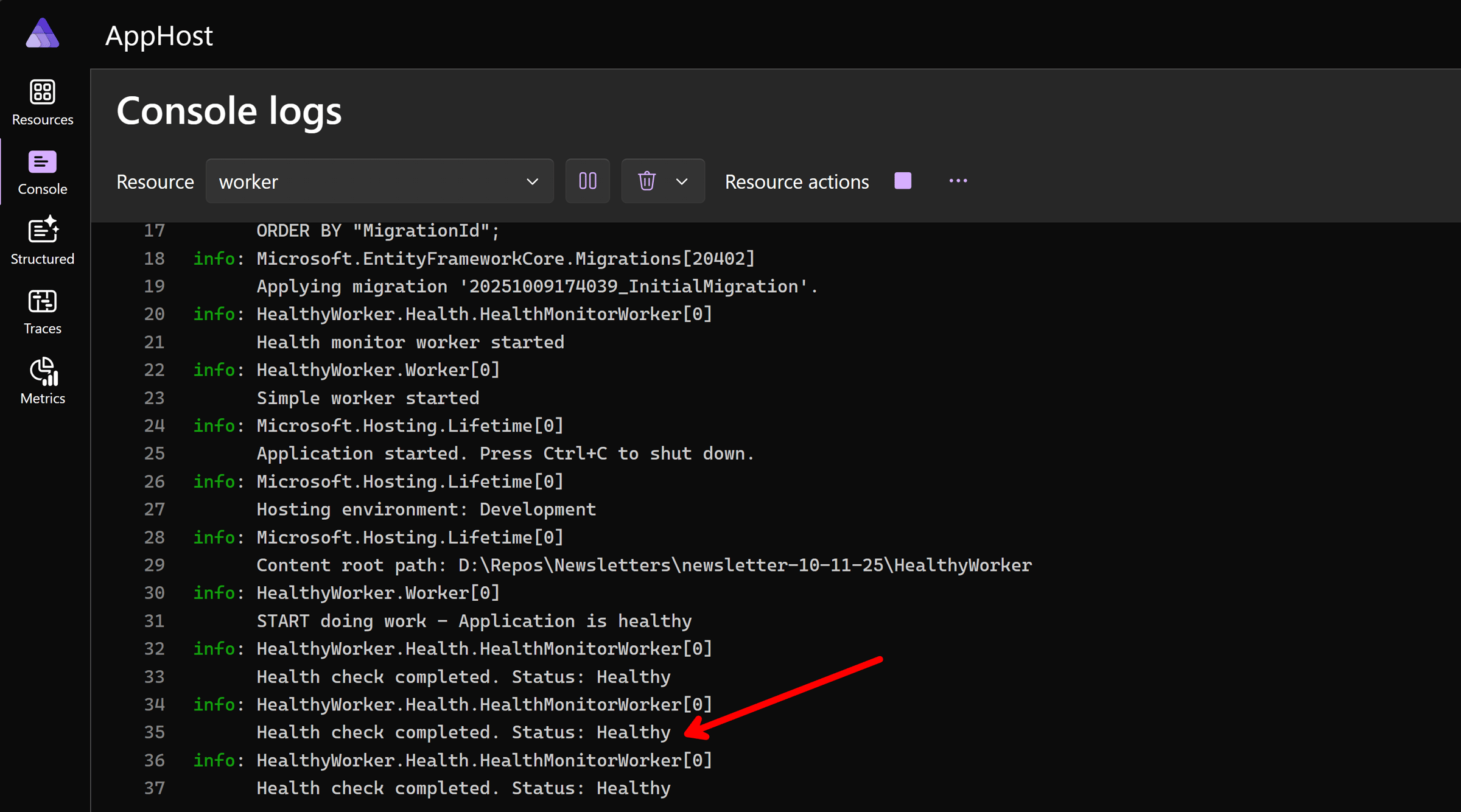 Now, if we dive into the Worker logs, we should see its health status being reported every 10 seconds:
