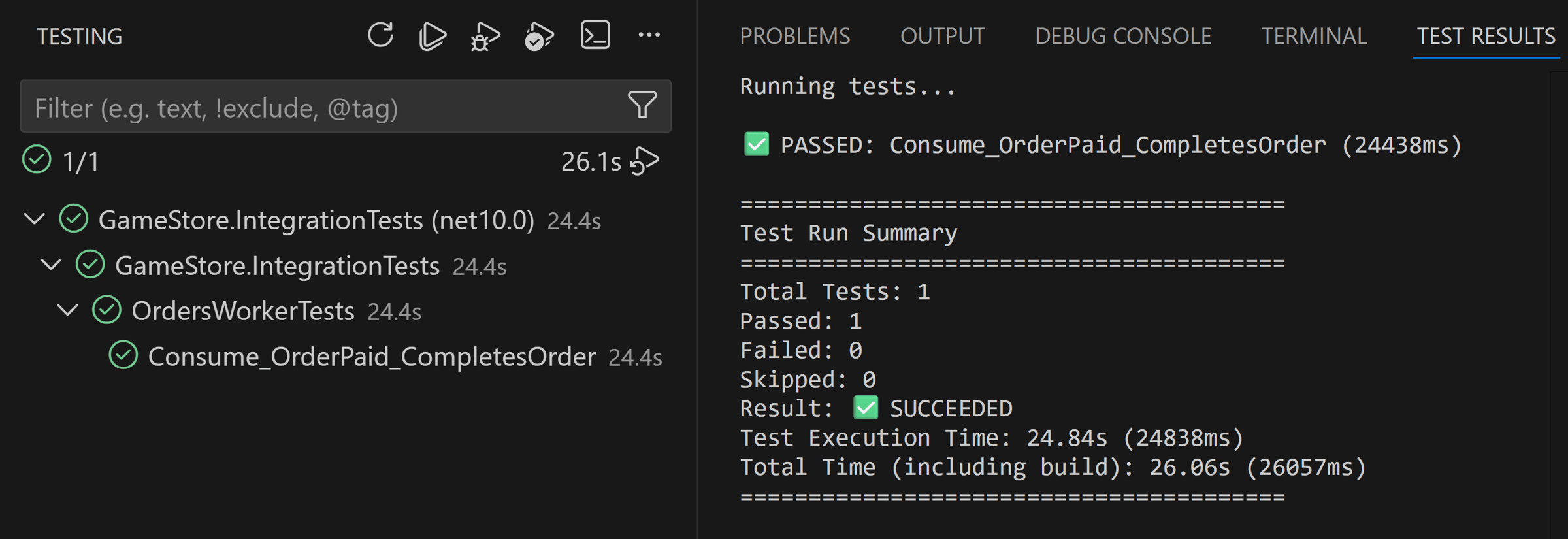 We could write all sorts of unit tests around the code used by our queue processor, but I find it more interesting to ensure that this .NET worker can update the Order status in a real database after consuming a real message from a real queue.