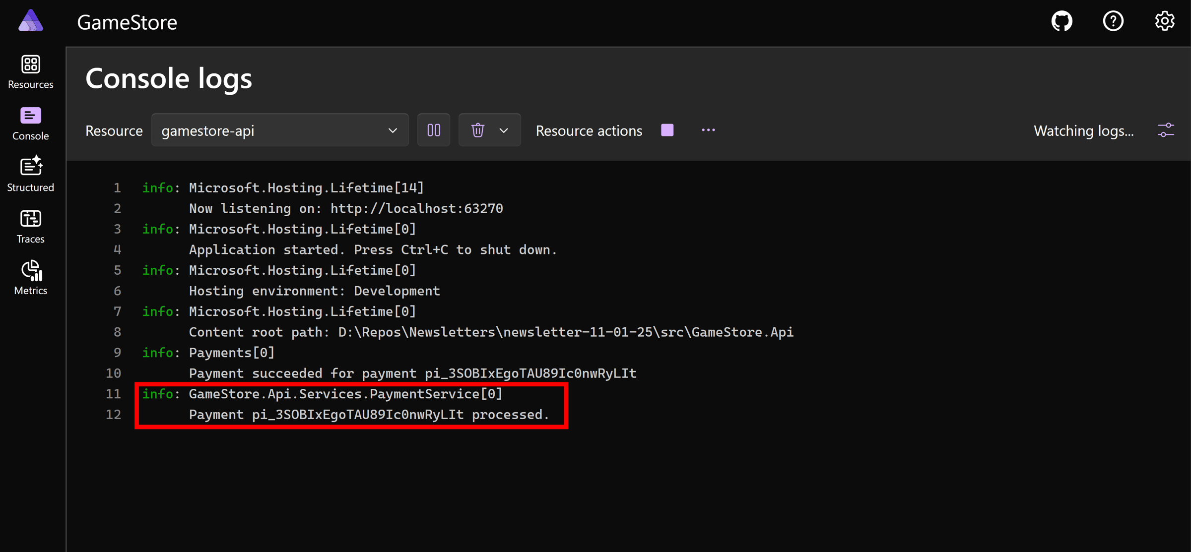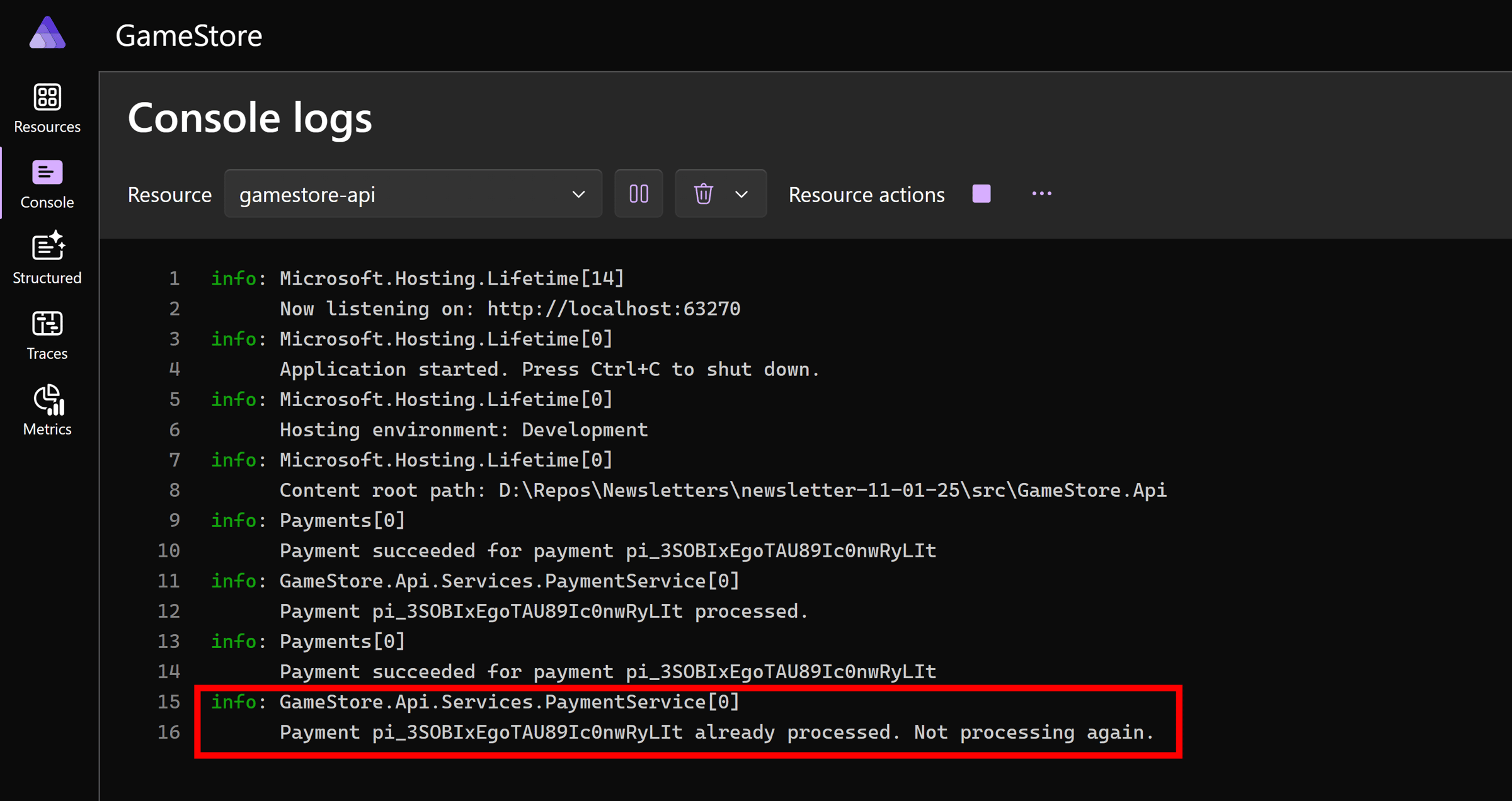 Looking at our API logs in the Aspire dashboard, we’ll confirm the event arrived: