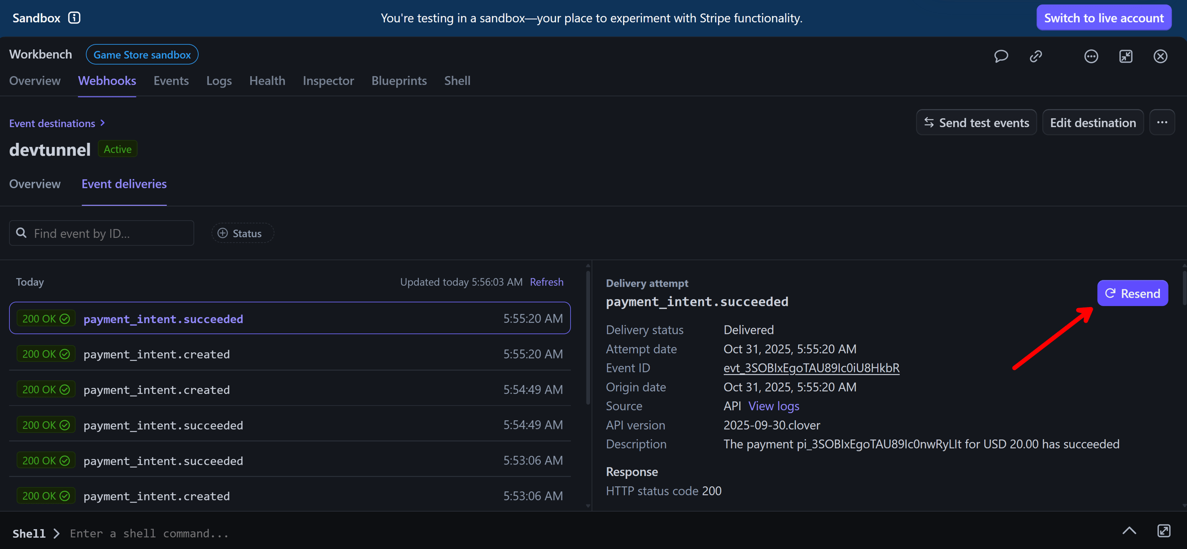 But what we really wanted to verify is the retry behavior. And, for this, we can use the Stripe Workbench to resend the event that we just triggered: